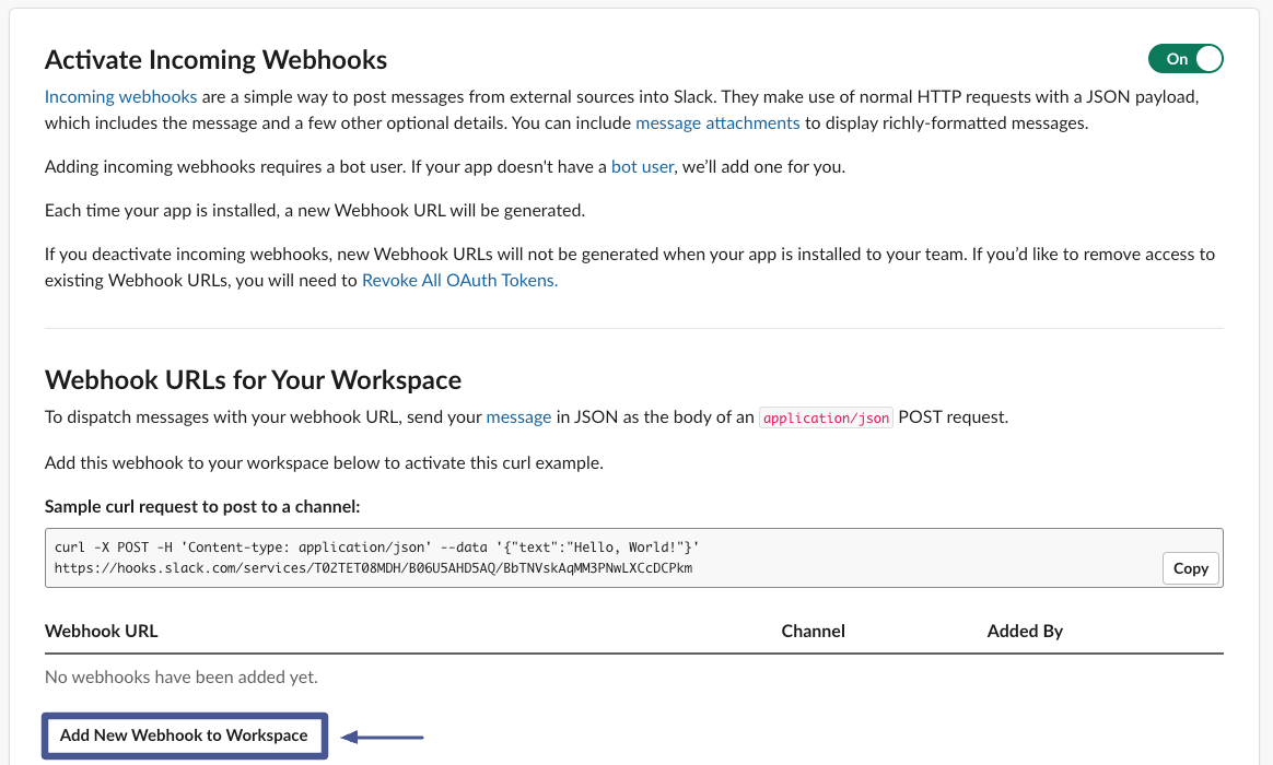 Incoming Webhooks. Click the slider button in the top right to turn the feature on. Then clickAdd New Webhook to Workspace.
